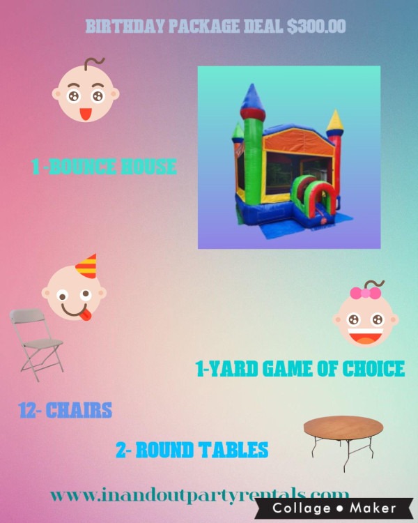 Corn Hole GameBirthday 1 DAY Package Deal:Corn Hole Game103256465_3278187_28972810100 This Corn Hole Game rental is perfect for adding some lighthearted competition to any event. It’s comprised of sturdy boards and bean bags designed for tossing, making it an ideal choice for family gatherings, parties, or backyard celebrations. Enjoy a playful challenge that’s easy to set up and fun for all ages.Jumbo Checker SetBirthday 1 DAY Package Deal:Jumbo Checker Set103256465_3278187_32741670100 Jumbo Checker Set — a large-scale, eye-catching version of the classic board game designed specifically for parties, events, classrooms, and backyard gatherings. This rental includes an oversized checkerboard that lies flat on the ground or a table and a full complement of extra-large checkers that are easy to see, handle, and move for players of all ages. The bold color contrasts on the board and pieces make the game readable across a distance, turning a familiar pastime into a social focal point that attracts players and onlookers alike.Built for durability and repeated use, the components are made from sturdy, smooth materials that resist scuffs and are simple to clean between rentals. The size boosts accessibility: kids, teens, and adults can play comfortably without bending over, and the large pieces are perfect for players with limited dexterity. Setup is quick — the board unfolds or lays out flat, pieces are placed on starting squares, and the game is ready to go — and breakdown is just as fast, making it a convenient option for short event windows.