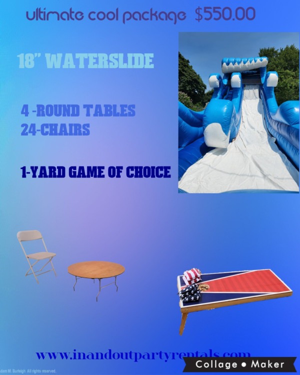 Corn Hole GameUltimate Cool Package:Corn Hole Game103256479_3278187_28972810100 This Corn Hole Game rental is perfect for adding some lighthearted competition to any event. It’s comprised of sturdy boards and bean bags designed for tossing, making it an ideal choice for family gatherings, parties, or backyard celebrations. Enjoy a playful challenge that’s easy to set up and fun for all ages.Jumbo Checker SetUltimate Cool Package:Jumbo Checker Set103256479_3278187_32741670100 Jumbo Checker Set β a large-scale, eye-catching version of the classic board game designed specifically for parties, events, classrooms, and backyard gatherings. This rental includes an oversized checkerboard that lies flat on the ground or a table and a full complement of extra-large checkers that are easy to see, handle, and move for players of all ages. The bold color contrasts on the board and pieces make the game readable across a distance, turning a familiar pastime into a social focal point that attracts players and onlookers alike.Built for durability and repeated use, the components are made from sturdy, smooth materials that resist scuffs and are simple to clean between rentals. The size boosts accessibility: kids, teens, and adults can play comfortably without bending over, and the large pieces are perfect for players with limited dexterity. Setup is quick β the board unfolds or lays out flat, pieces are placed on starting squares, and the game is ready to go β and breakdown is just as fast, making it a convenient option for short event windows.